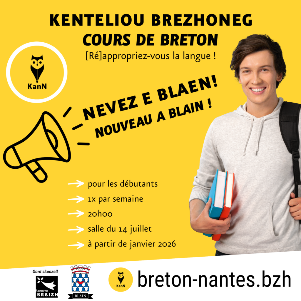 Bienvenue – Donemat Kentelioù an Noz (Cours du soir) propose des cours et des stages de breton sur Nantes et en Loire-Atlantique ainsi que des activités et événements en langue bretonne. Pour nous soutenir, cliquez-ici ACTUALITES ABONNEZ-VOUS A NOTRE NEWSLETTER NOS RESEAUX SOCIAUX Facebook Instagram Youtube Linkedin Twitter