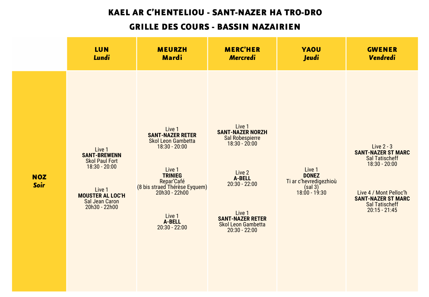 ⚠️ Ar gael-mañ a zo c’hoazh da vezañ kadarnaet kentelioù zo enni ⚠️ Betek miz Gwengolo e c’hallo bezañ cheñchamañtoù er gael. Ur gentel pe ziv a c’hall bezañ nullet ivez. Reoù all a c’hallo bezañ ouzhpennet.