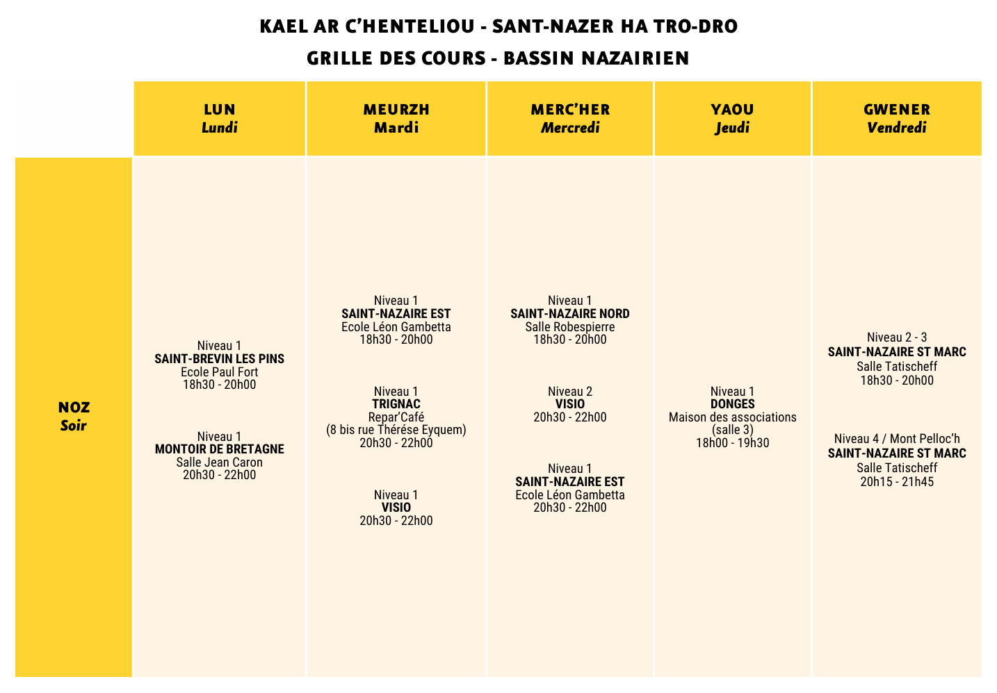 KanN propose des cours de breton pour adultes en Loire-Atlantique. Le cursus classique de cours du soir est composé de 5 niveaux. A la fin de ce cursus, vous aurez toutes les compétences pour comprendre et être compris !